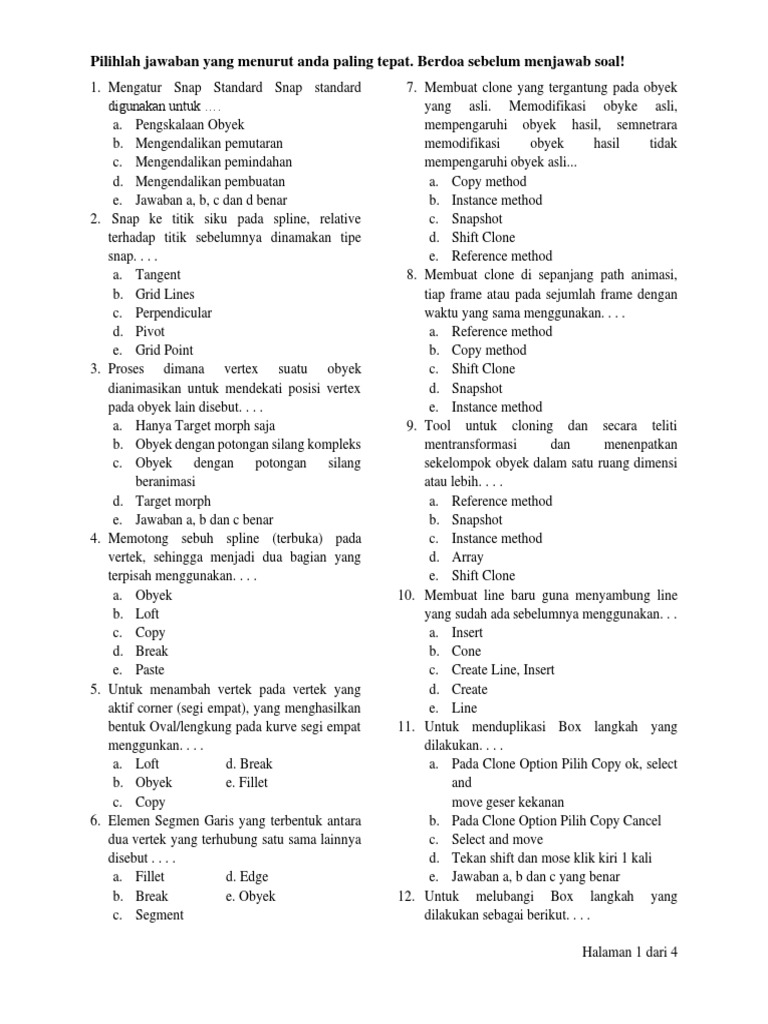Karena dilihat dari segi pemanfaatan dan penggunaanya sistem ilearning survey (isur) ini menjadi salah satu dari sebuah terobosan baru dari pembelajaran ilearning yang ada pada perguruan tinggi raharja dan salah satu sistem pendukung dari 4b, yang dicetus atau di kemukakan oleh pimpinan perguruan tinggi raharja yaitu ir.untung rahardja (2011. Obyek membuat spline shape pengeditan obyek 42. Jawaban a, b dan c benar. Secara sederhana, istilah pembelajaran (instructions) bermakna sebagai upaya untuk mebelajarkan seseorang atau kelompok orang melalui berbagai upaya (effort) dan berbagai strategi, metode dan pendekatan ke arah pencapaian tujuan yang telah direncanakan.pembelajaran merupakan proses utama yang diselenggarakan dalam kehidupan di sekolah sehingga. Tool untuk cloning dan secara teliti mentransformasi dan menenpatkan sekelompok obyek dalam satu ruang dimensi atau lebih.